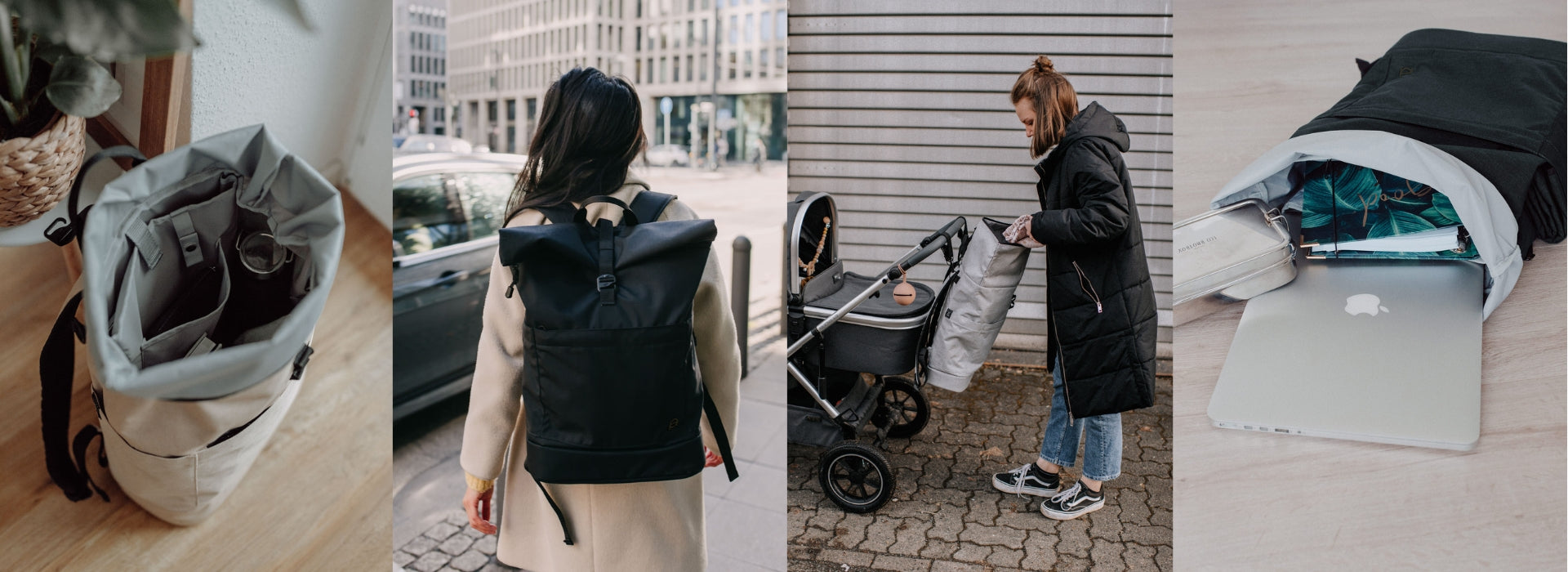 Innen: Hellgraues abwaschbares Innenfutter, zwei Steckfächer, 1 Reißverschlussfach, Löffel- und Stift-Halter, Clipband (z.B. für Schnuller) und Flaschenfach, gepolstertes Laptop-Fach (bis 16 Zoll).